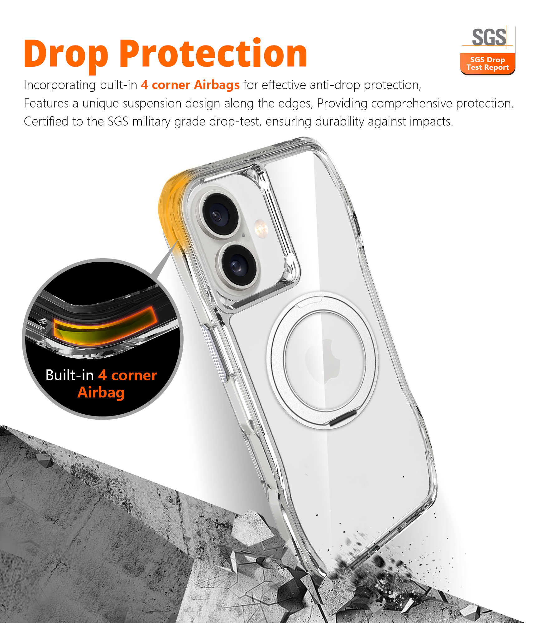 Incorporating built-in 4 corner Airbags for effective anti-drop protection, Features a unique suspension design along the edges, Providing comprehensive protection.Certified to the SGS military grade drop-test, ensuring durability against impacts.