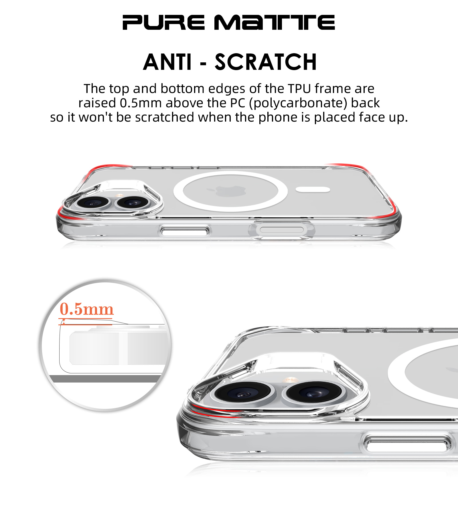 The top and bottom edges of the TPU frame are raised 0.5mm above the PC (polycarbonate) back so it won’t be scratched when the phone is placed face up.