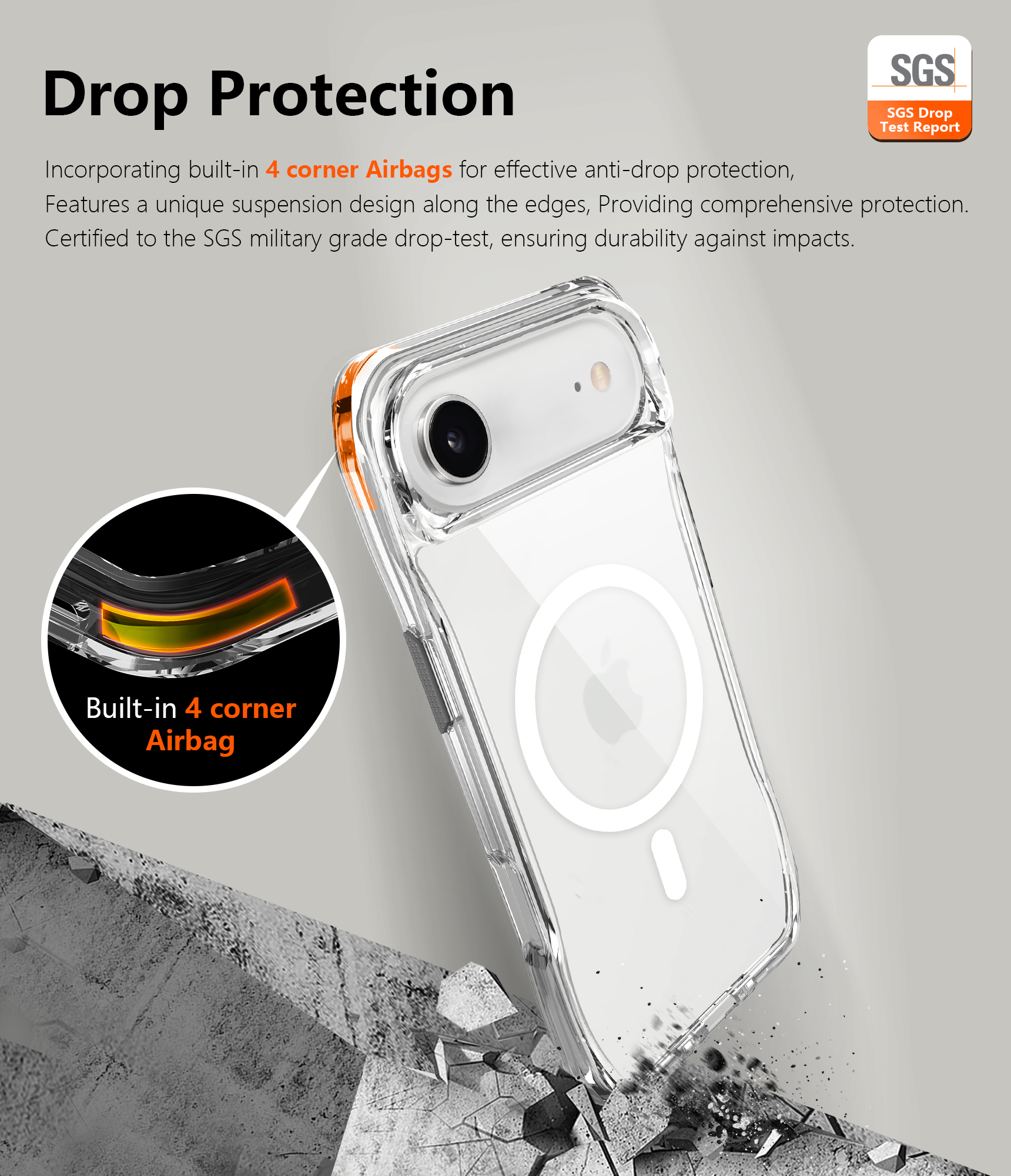 Incorporating built-in 4 corner Airbags for effective anti-drop protection, Features a unique suspension design along the edges, Providing comprehensive protection.Certified to the SGS military grade drop-test, ensuring durability against impacts.