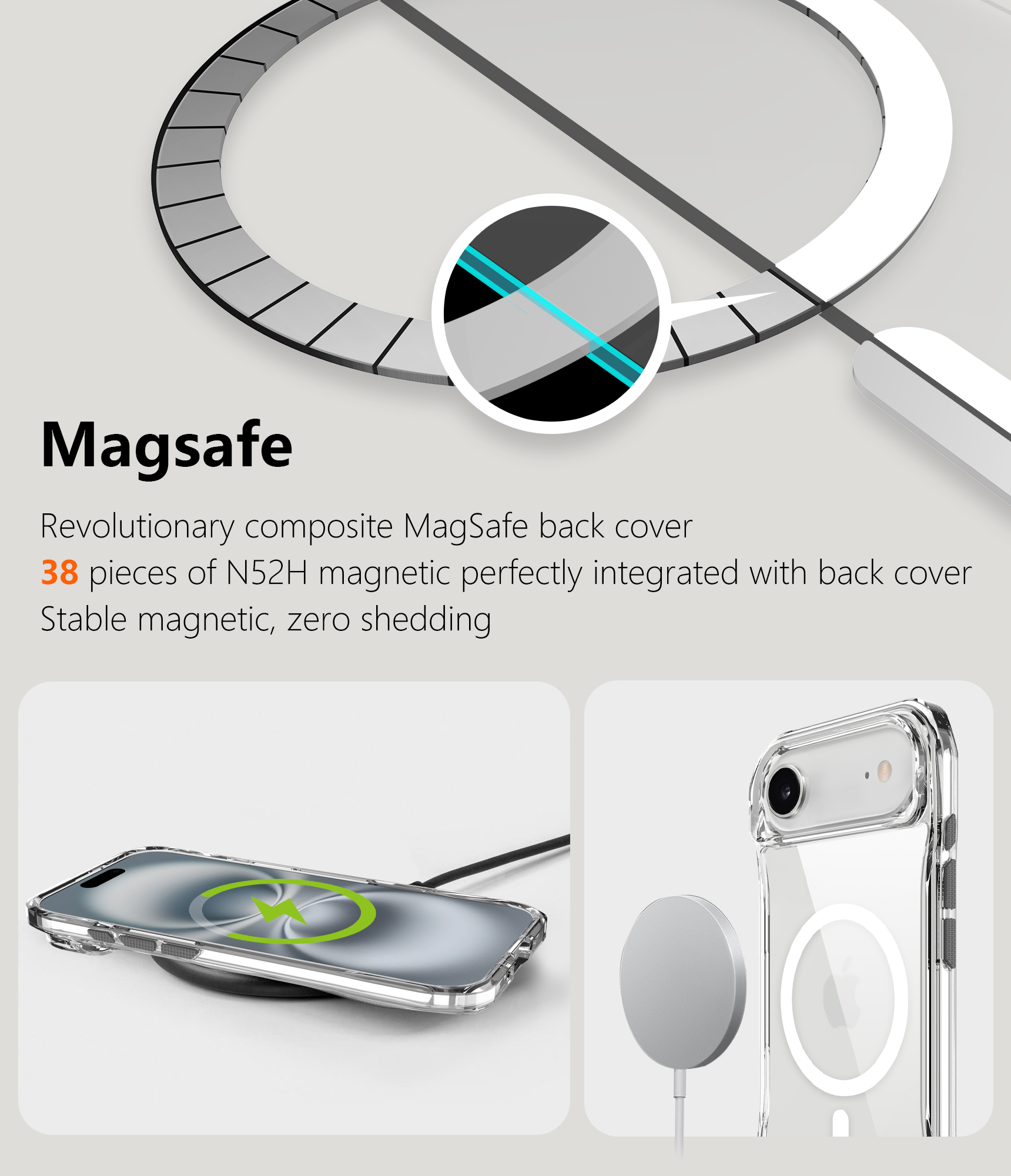 Revolutionary composite MagSafe back cover 38 pieces of N52H magnetic perfectly integrated with back cover.Stable magnetic, zero shedding
