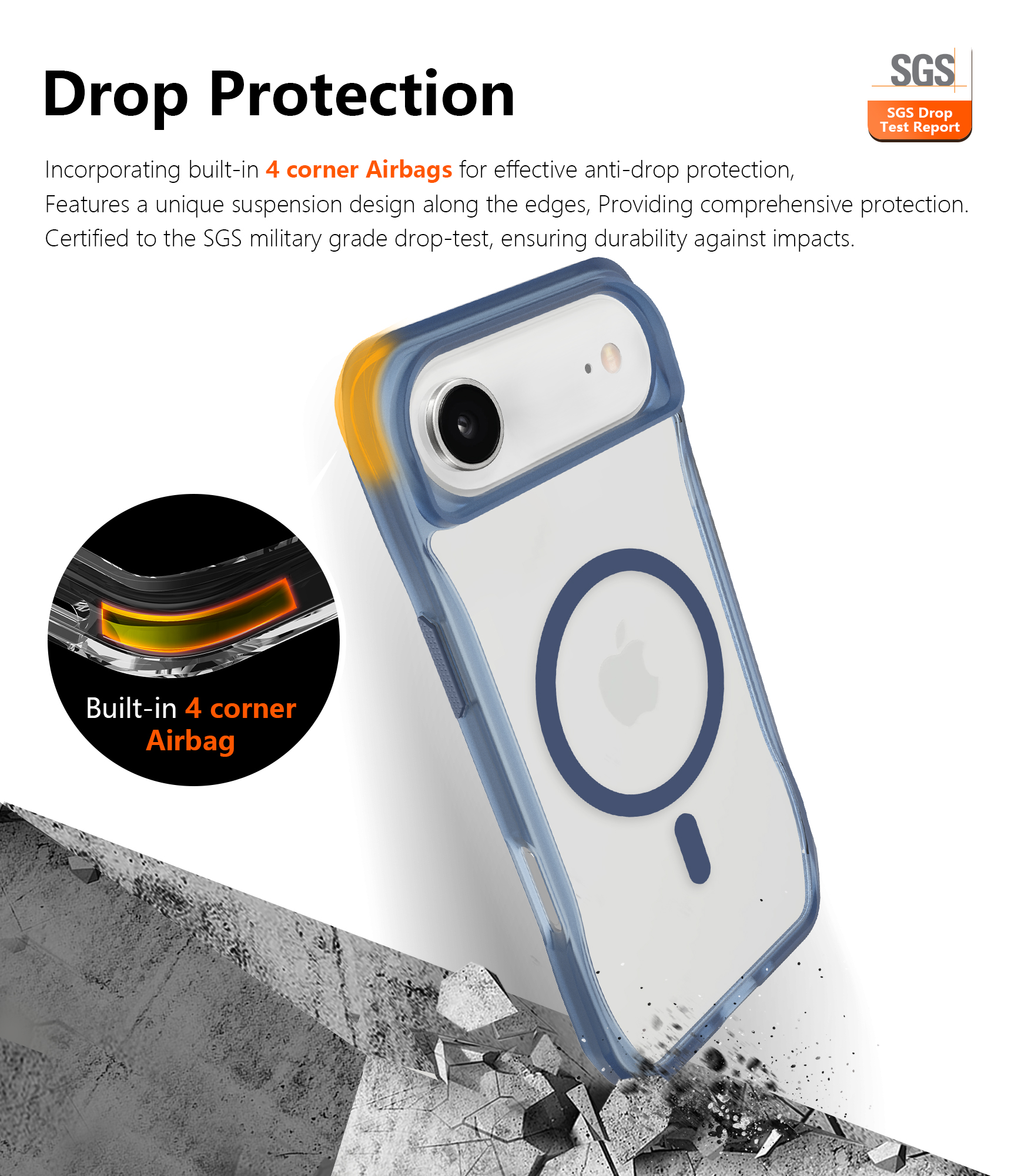 Incorporating built-in 4 corner Airbags for effective anti-drop protection, Features a unique suspension design along the edges, Providing comprehensive protection.Certified to the SGS military grade drop-test, ensuring durability against impacts.