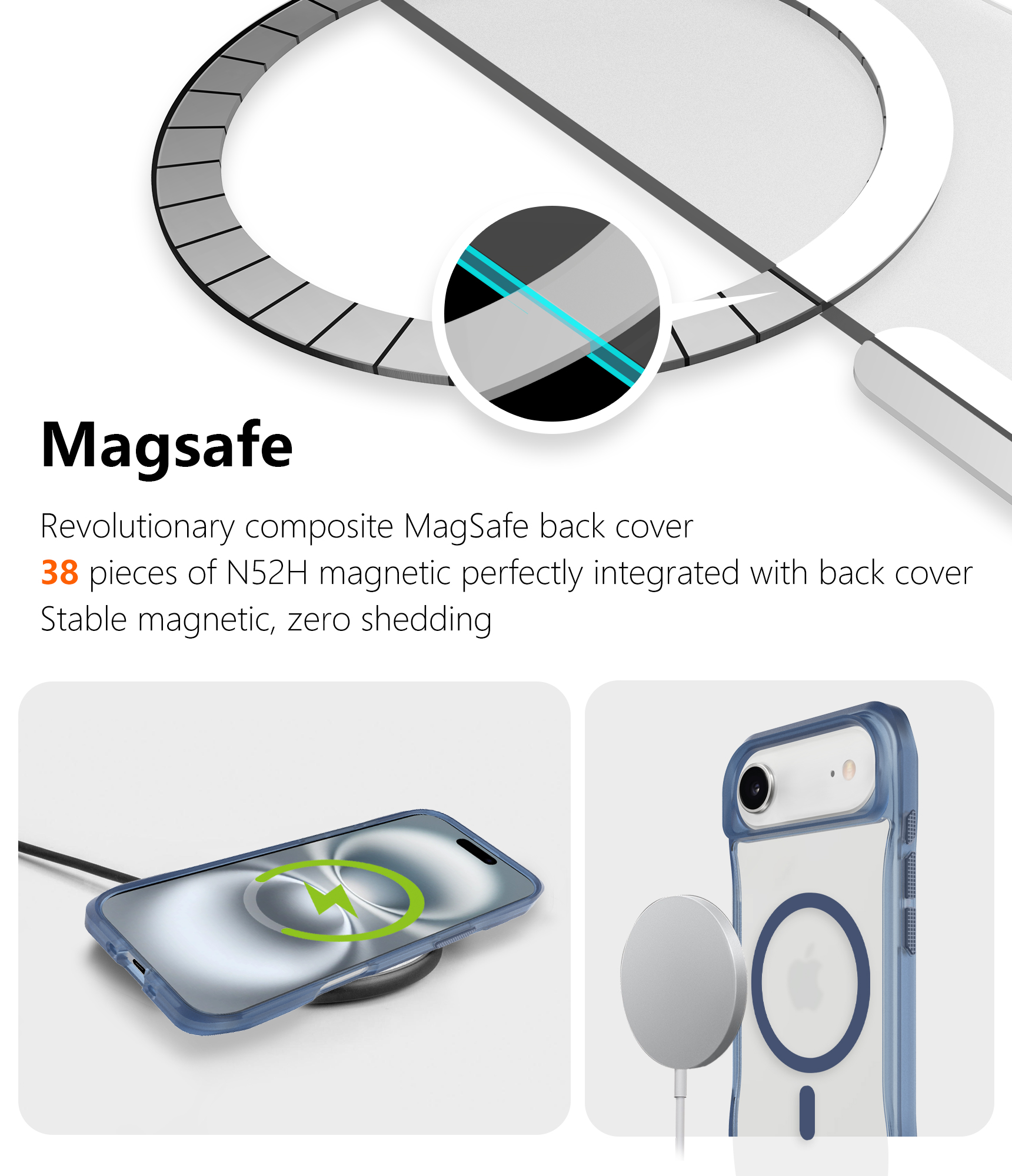 Revolutionary composite MagSafe back cover 38 pieces of N52H magnetic perfectly integrated with back cover.Stable magnetic, zero shedding