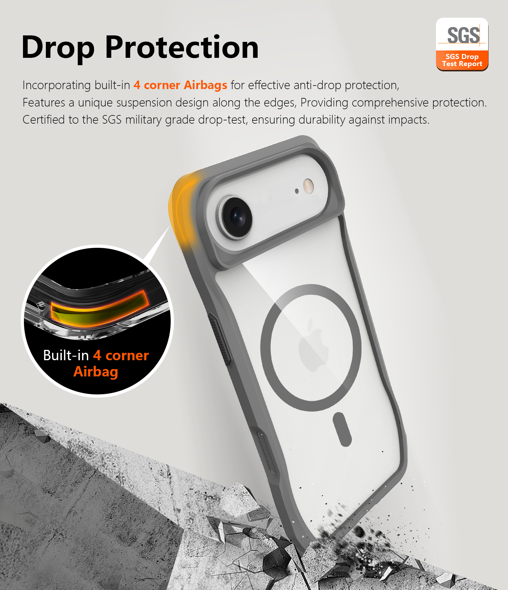 Incorporating built-in 4 corner Airbags for effective anti-drop protection, Features a unique suspension design along the edges, Providing comprehensive protection.Certified to the SGS military grade drop-test, ensuring durability against impacts.