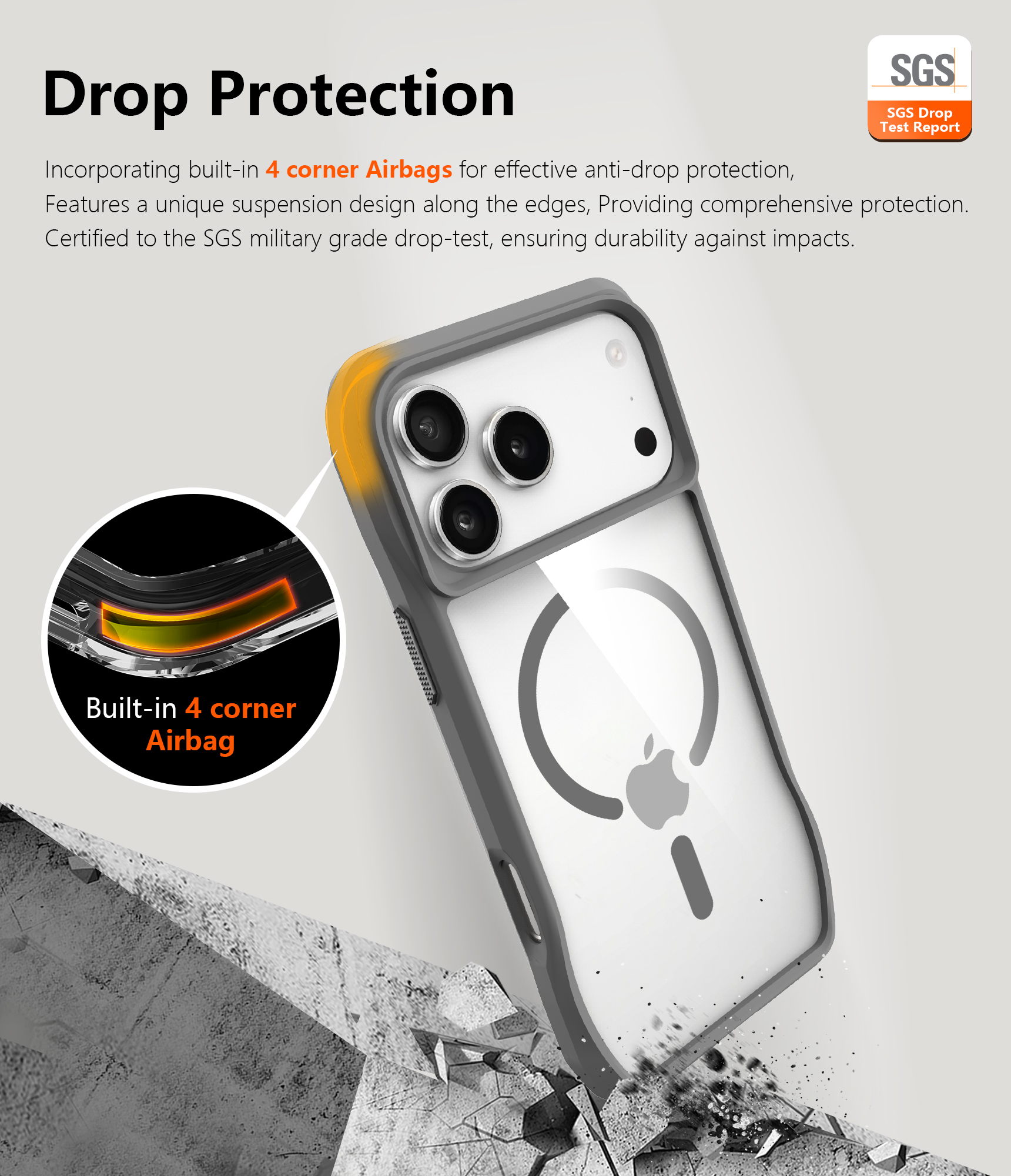 Incorporating built-in 4 corner Airbags for effective anti-drop protection, Features a unique suspension design along the edges, Providing comprehensive protection.Certified to the SGS military grade drop-test, ensuring durability against impacts.