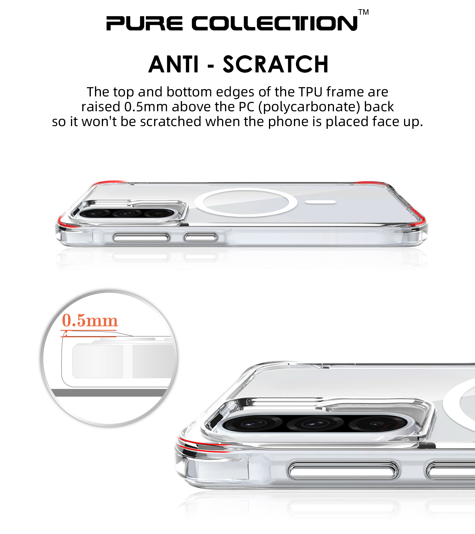 The top and bottom edges of the TPU frame are raised 0.5mm above the PC (polycarbonate) back so it won’t be scratched when the phone is placed face up.
