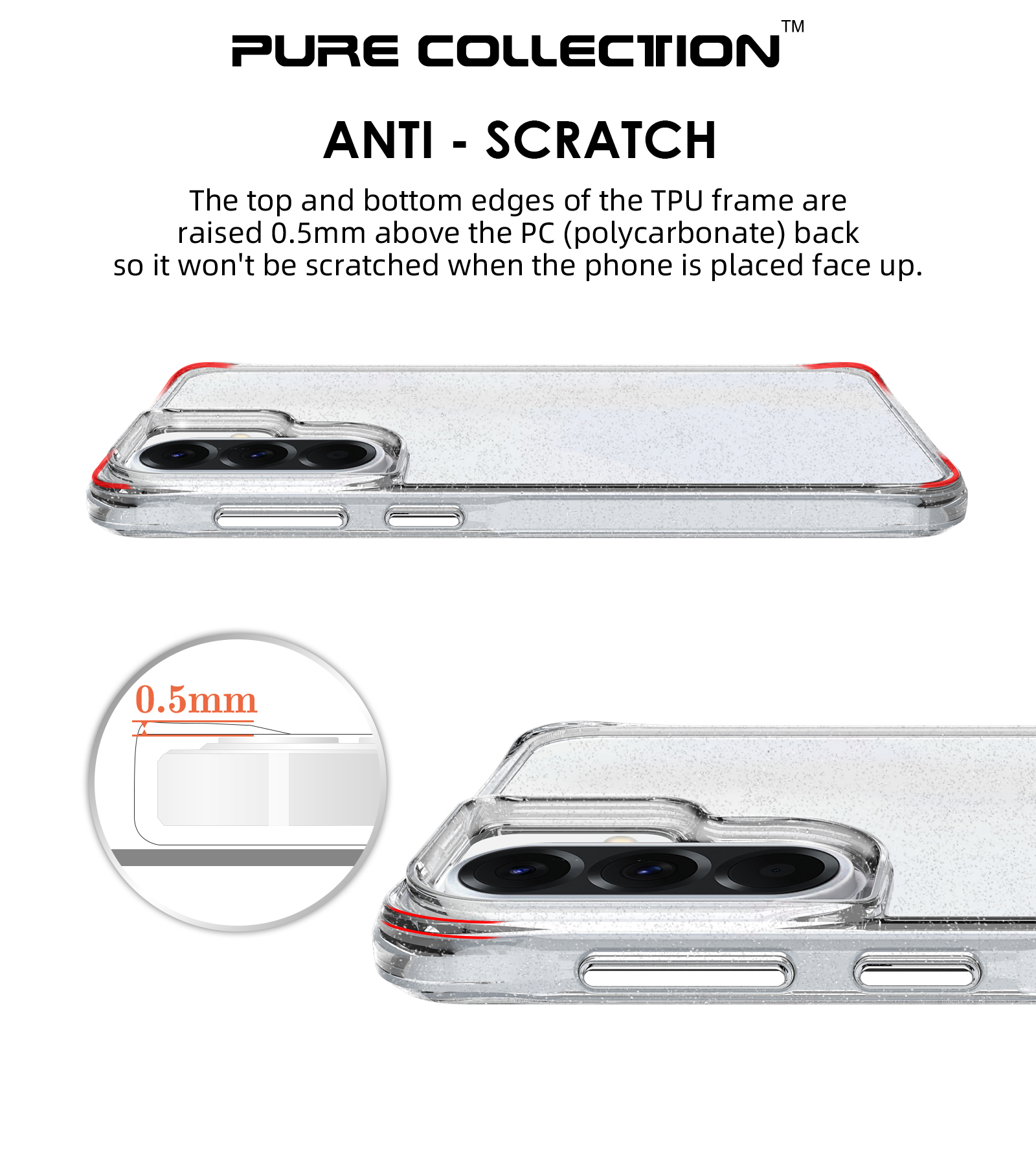 The top and bottom edges of the TPU frame are raised 0.5mm above the PC (polycarbonate) back so it won’t be scratched when the phone is placed face up.