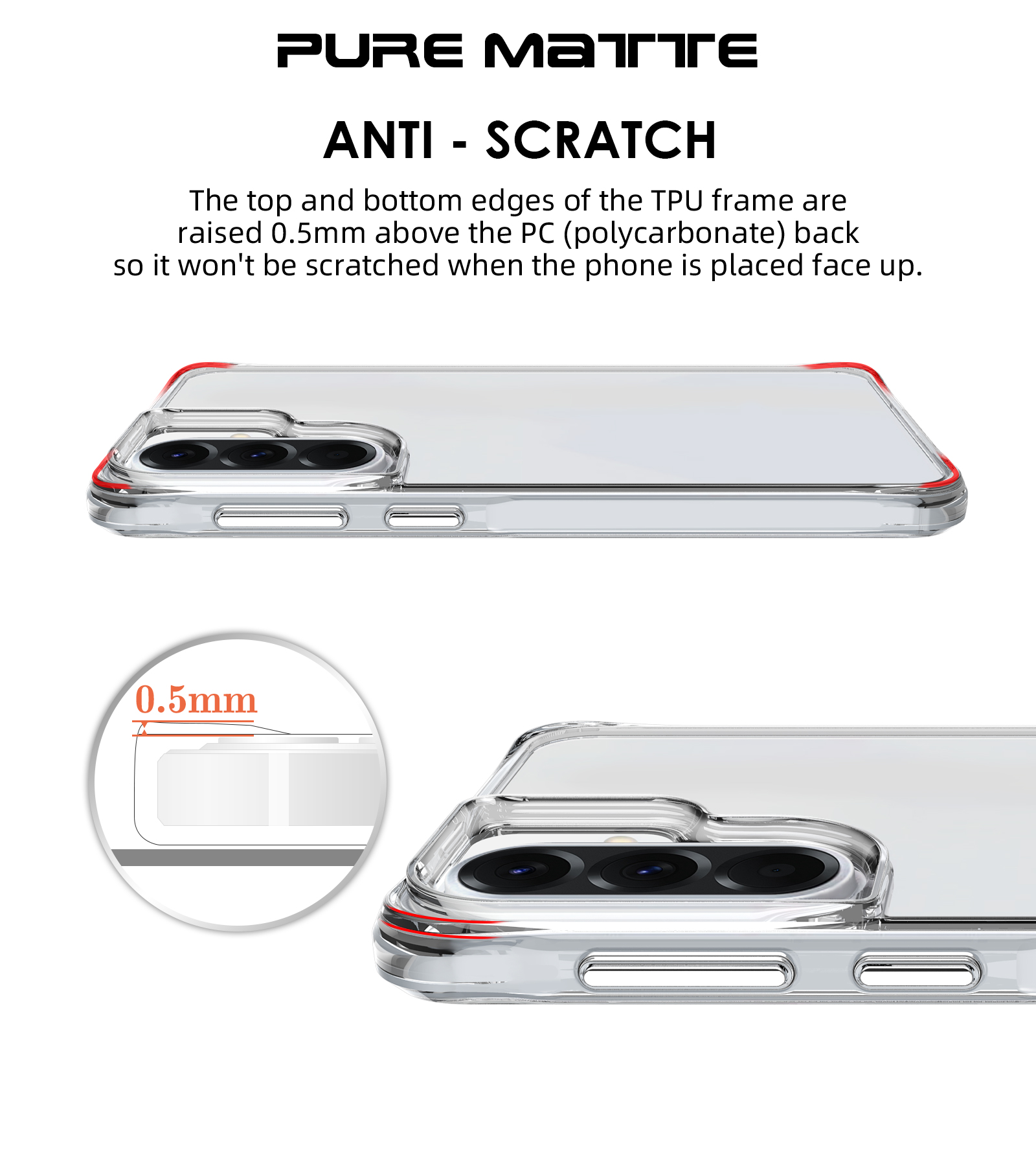 The top and bottom edges of the TPU frame are raised 0.5mm above the PC (polycarbonate) back so it won’t be scratched when the phone is placed face up.
